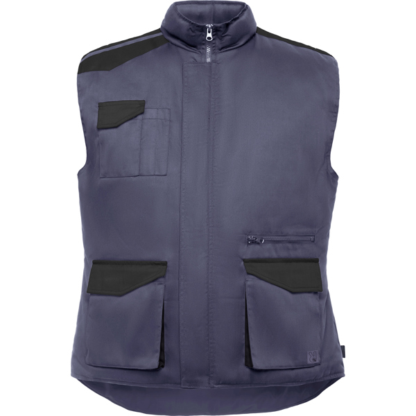 Colete de trabalho multibolsos em combinação bicolor, com gola alta.