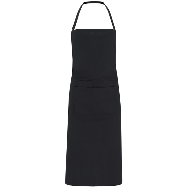 Avental longo com bolso duplo frontal e tiras de amarração combinando.