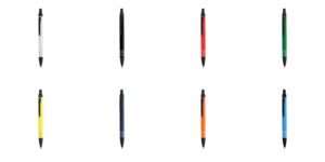 De mecanismo de botão, com acessórios em cor negra e anéis em prata. De cartucho jumbo e em tinta azul. Distintivo de Alumínio Reciclado na parte superior.